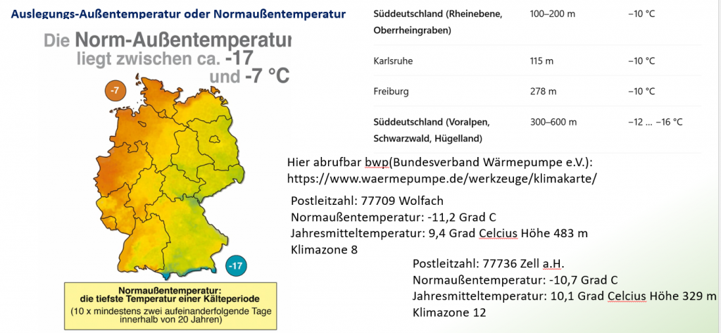 Aber wie kommt man nun auf die Größe der benötigten Wärmepumpe wenn man in etwa die Heizlast kennt? Die Wärmepumpe sollte bei – 7 Grad C Außentemperatur die Energie für das Haus liefern können. Die Heizlast des Hauses ist ja auf die kältesten Tage ausgelegt. Bei diesen wenigen kalten Tage wird zur Unterstützung ein elektrischer Heizsstab zugeschaltet. Deshalb darf der max. Nennwert etwas unter der Heizlast liegen. Natürlich könnte die zweite Heizquelle auch ein Holzofen sein oder eine Gastherme. Das ist jedoch nur sinnvoll, wenn diese Wärmequelle schon vorhanden ist.