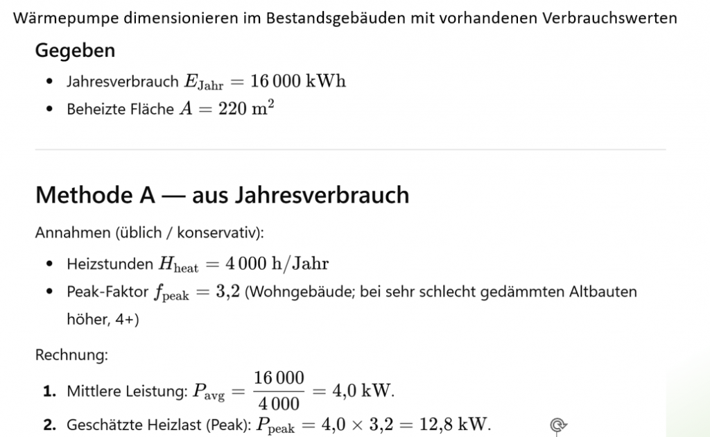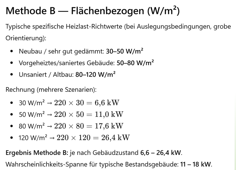 Aha, nun wissen wir für ein exemplarisches Bestandsgebäude, ca. 30 Jahre alt, hat den Heizbedarf von einem 20 m² Raum mit einem Fenster von 0,53 kW. Für den Gesamtbedarf des Hauses sollten aber noch vorhandene Kältebrücken wie betonierte Balkone, ungedämmte Keller und Dachräume hinzukommen. Ein 200 m² Haus hätte nach dem obigen Musterraum ja nur 10 x 0,53=5,3 kW Heizlast. Das ist nur für neue gut gedämmte Häuser realistisch. Ein 30 Jahre altes Haus mit gedämmten Dach und Keller mit 200 m² Wohnfläche hat vermutlich eine Heizlast bei -15 Grad C von 12 bis 16 kW nur für die Heizung. Das warme Wasser wird getrennt berechnet.