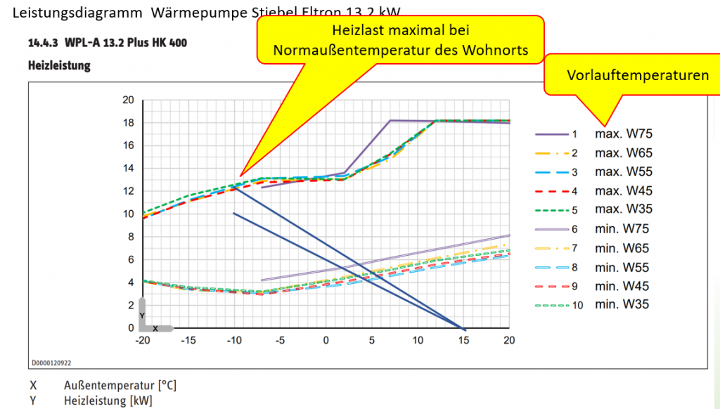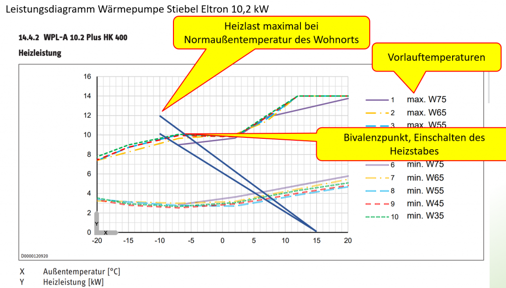 Wenn sie eine Heizlinie mit der Heizlast von 15 kW bei – 10 Grad C einzeichnen, dann liegt der Bivalenzpunkt bei ca -3 Grad, sprich der Heizstab kommt sehr häufig zum Einsatz und das wird teuer. Eine Wärmepumpe arbeitet nur effektiv, wenn die Wärmepumpe exakt zur Heizlast des Gebäudes passt. Deshalb ist eine genaue Heizlastberechnung unumgänglich!
