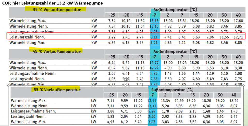 Nun fehlt es aber noch an der Effizienz der Wärmepumpe. Sie kann zwar das Gebäude beheizen, auch bei Vorlauftemperaturen von 65 Grad C, wie man in dem Diagramm erkennt. Allerdings leidet die Effizienz. Das ist der COP oder die Leistungszahl. Die Leistungszahl ist in untenstehender Tabelle angegeben bei verschiedenen Vorlauf- und Außentemperaturen. Je höher die Vorlauftemperatur der Heizung, um so schlechter der COP.