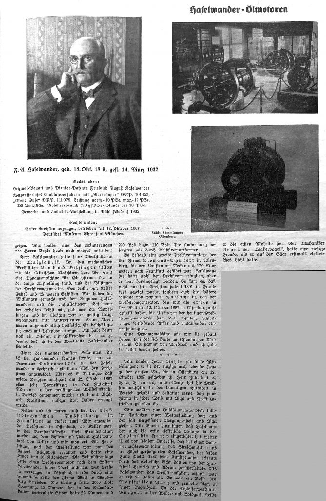 Friedrich-August Haselwander hat in Offenburg 1887 einen funktionsfähigen 3phasigen Drehstromgenerator in Betrieb gesetzt. Er hat darauf Patente erhalten. Die Großindustrie wurde aufmerksam. So wurde ihm von Siemens Lizenzgebühren für jedes PS gebauter Leistung angeboten, was Haselwander ablehnte. Der Firma AEG ist es gelungen, ihm die Patente streitig zu machen und für sich zu nutzen. Der Oberingenieur von AEG ein Herr Dolivio-Dobrowolski gilt bis heute als Erfinder des 3 phasigen Drehstrom-Asynchron-Motors.