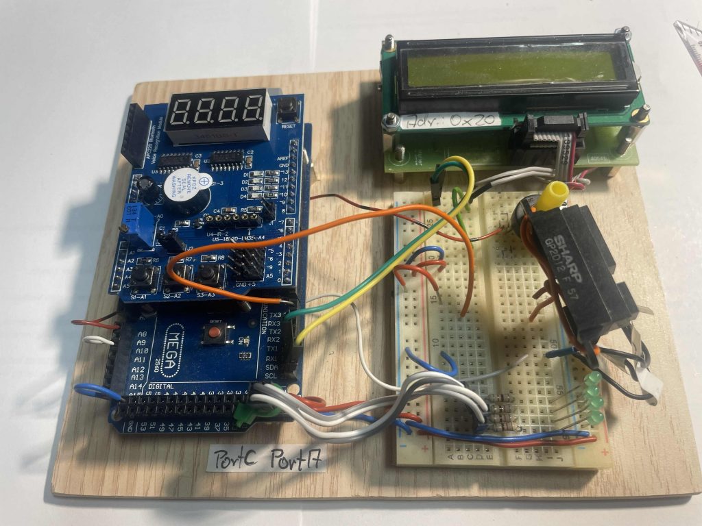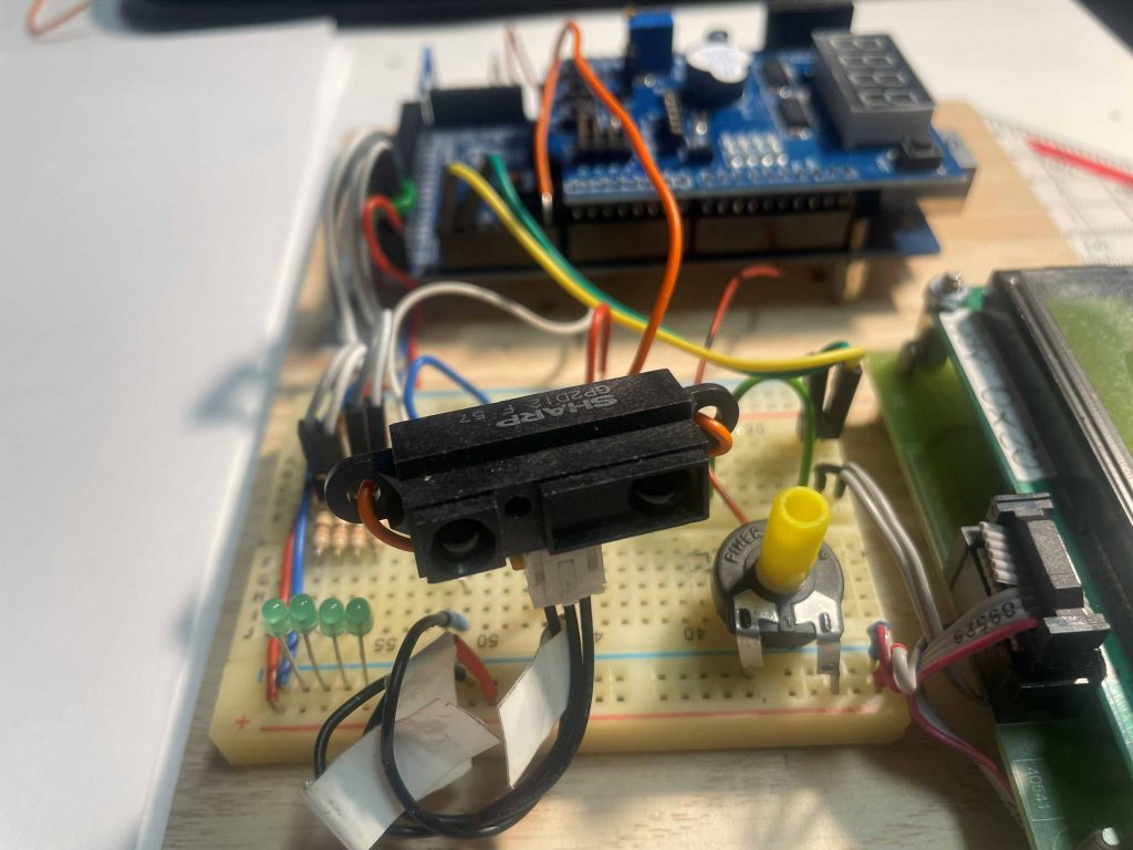 Der SHARP Sensor auf einem kleinen Entwicklungsbord mit Multi-Funktion-Shield (ca. 3 bis 5€) und Arduino MEGA Controller mit kleinem Steckboard und IIC-LC Display.