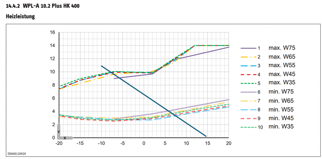 In das Leistungsdiagramm der Wärmepumpe mit 10,2 kW thermischer Leistung ist hier die Heizlastkurve eingezeichnet. Max Heizlast bei -10Grad C ist 11 kW, so berechnet für unser Haus. Der Bivalenzpunkt liegt bei – 8Grad C. Ab dieser Außentemperatur springt der Heizstab an. Das ist eine optimale Dimensionierung. Erst bei +7 Grad C Außentemperatur beginnt die Anlage zu takten. Das ist ebenfalls ein guter Wert.