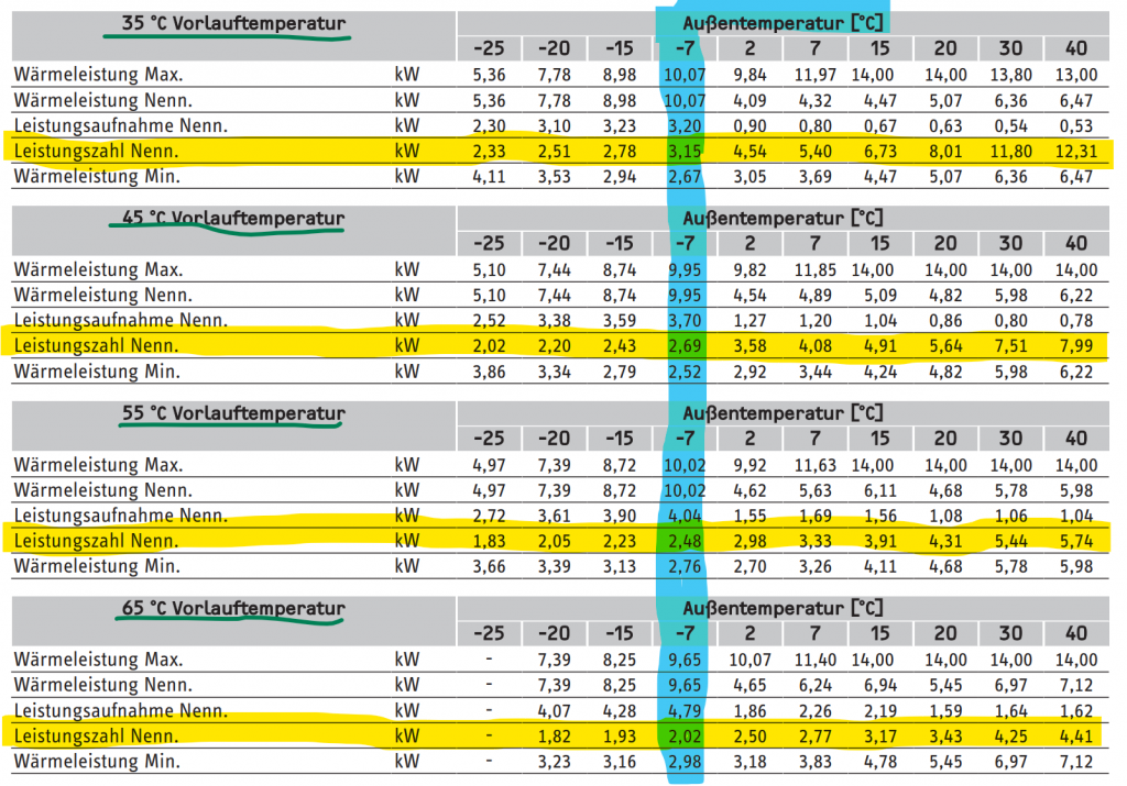 z.B. bei -7 Grad Außentemp.: 35 Grad Vorlauf: 3,15 45 Grad: 2,69 55 Grad: 2,48 65 Grad: 2.02