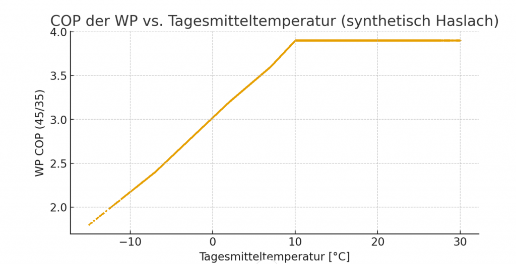 Hier der durchschnittliche COP, von der KI für Haslach i. K. berechnet nach meinen Vorgaben: